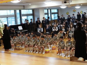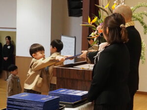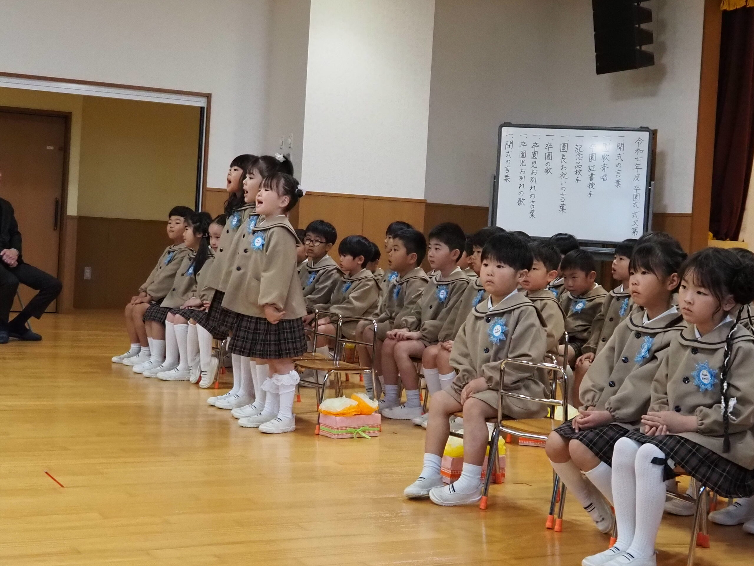 本日、卒園式が行われました。立派な態度で卒園証書を頂きました。園歌やお別れの言葉、歌も大きな声でしっかりできました。来賓、保護者、先生方など多くの方の見送りの中、楽しく過ごした幼稚園を巣立っていきました。