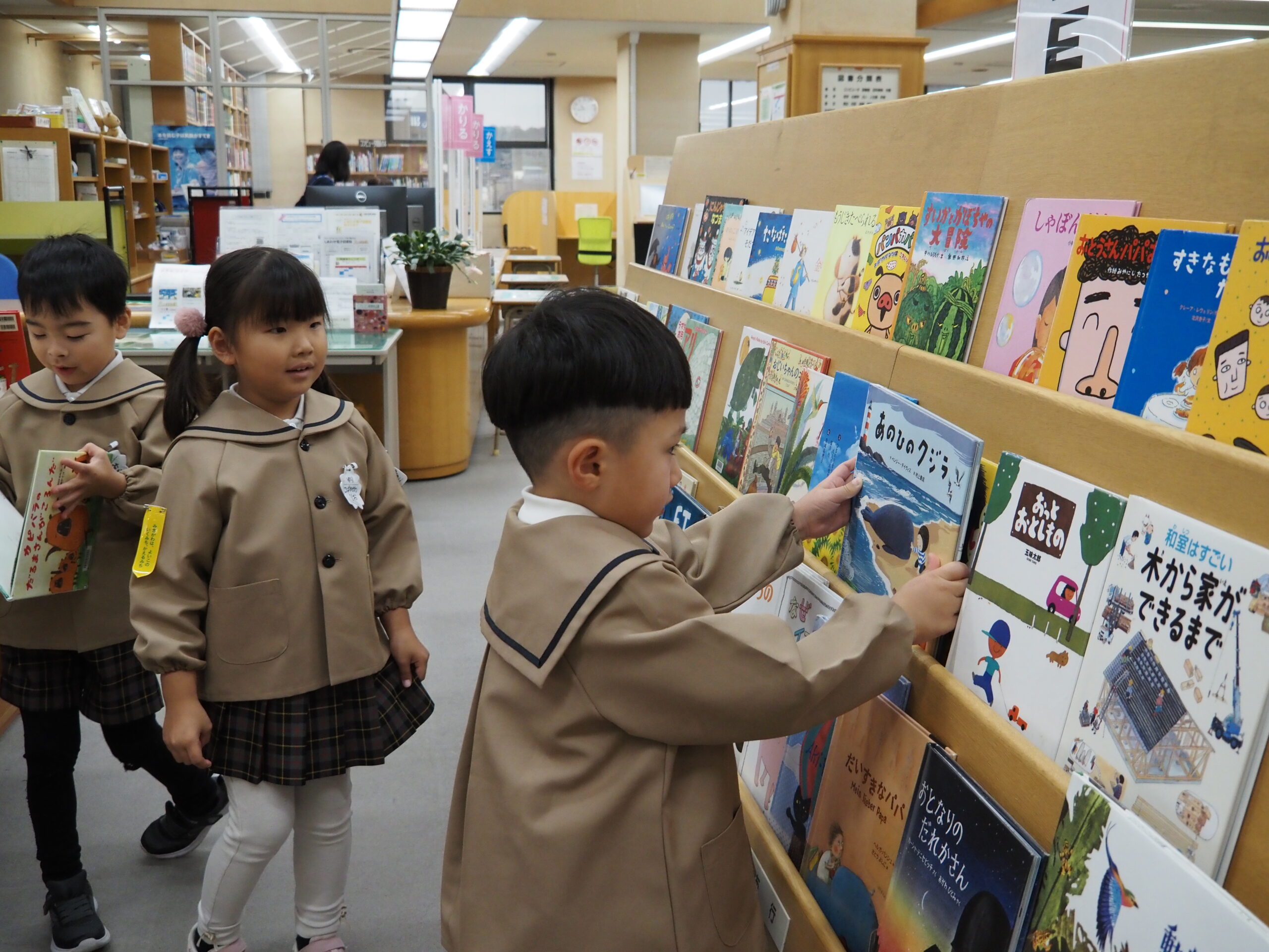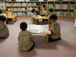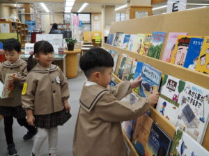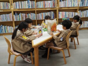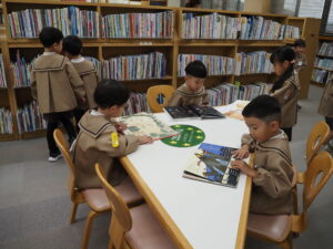 年長組は志免町の図書館見学に行きました。館内では大変お行儀よく、たくさんの絵本などを見て楽しく過ごしました。