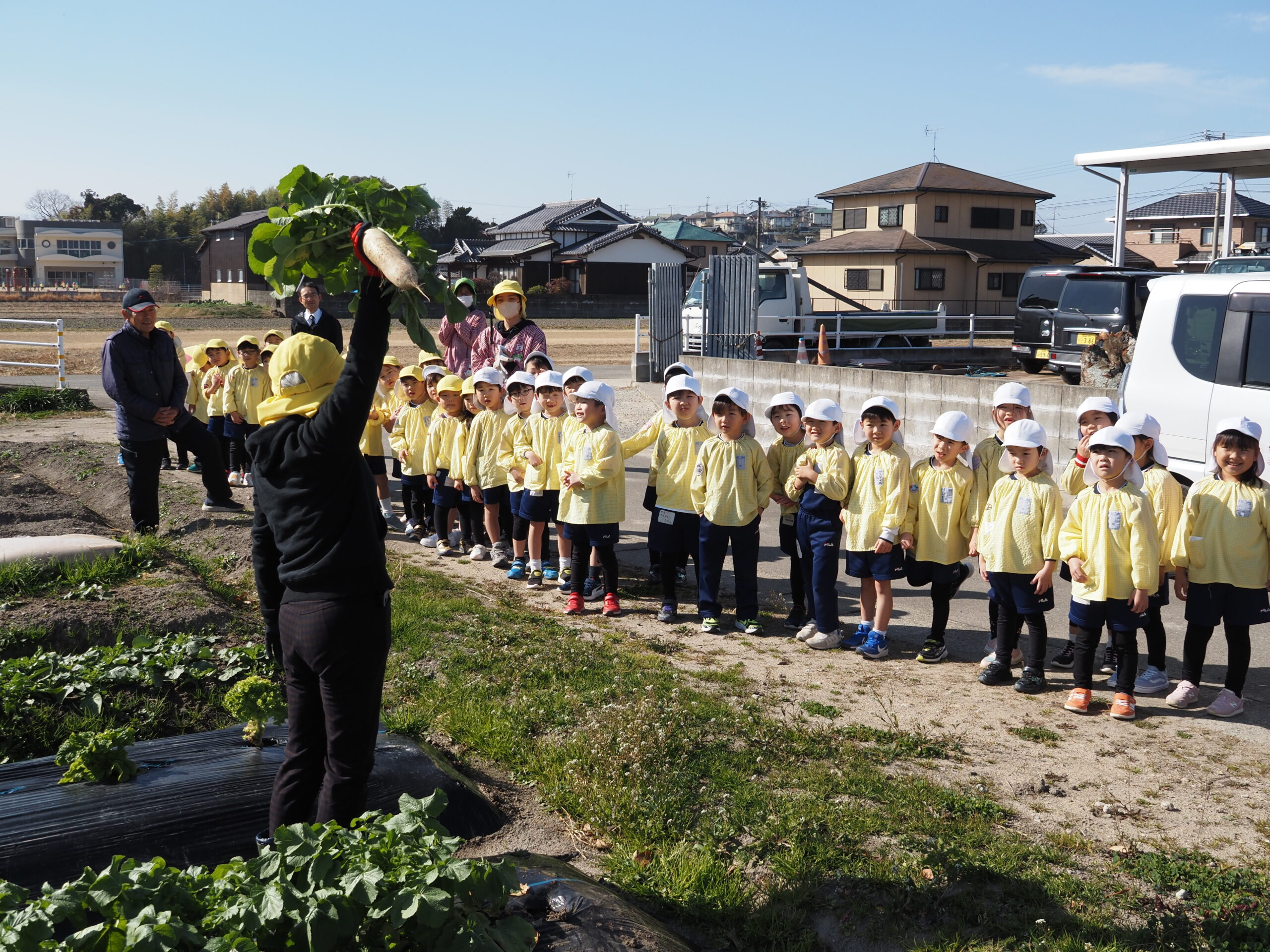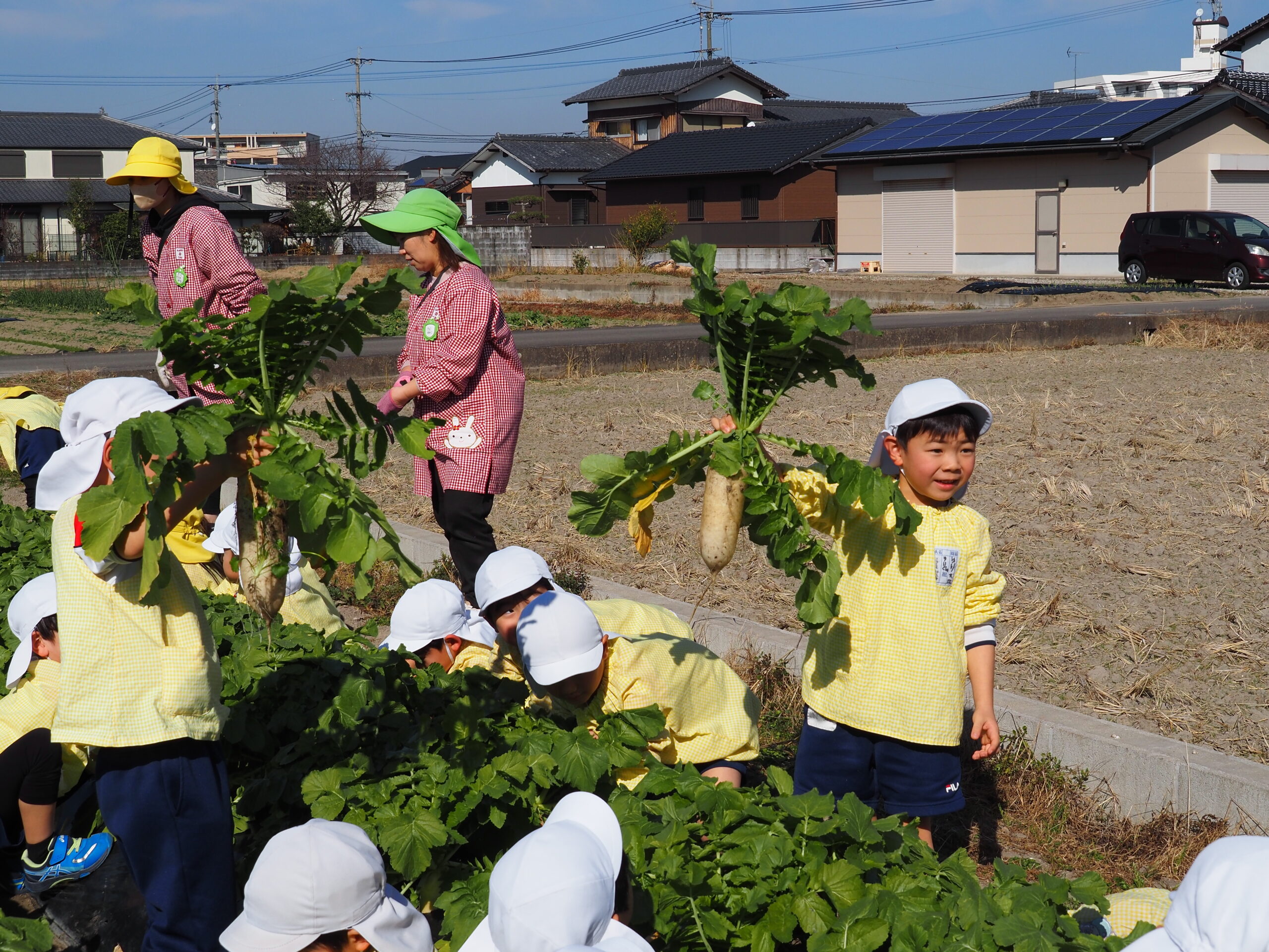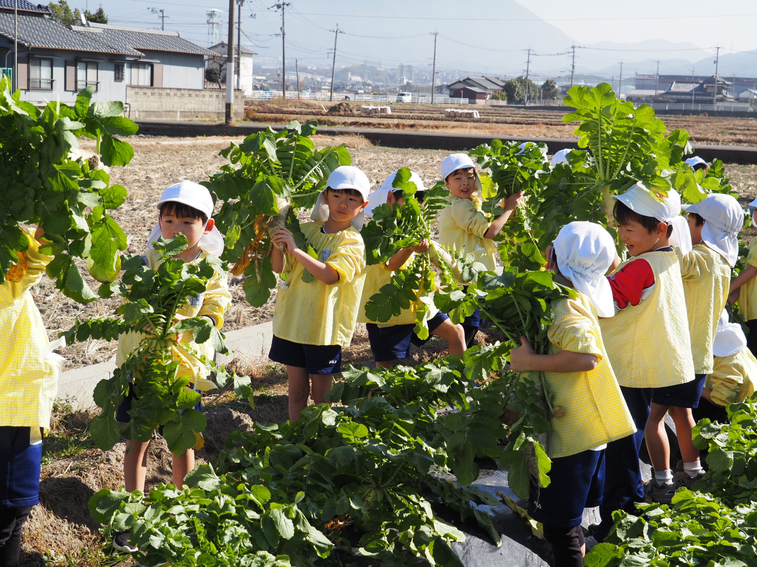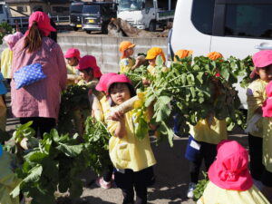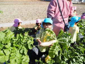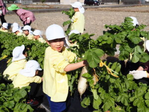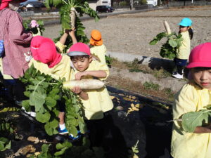 大根取り 2026.01.16 暖かい天候に恵まれ、大根取りを行いました。年長さんが種をまいて、農家の方がお世話をして頂いたおかげで大きな大根を取ることが出来ました。力を入れて大きな大根を抜くと、みんな大喜びでした。 令和8年1月の園庭開放 前の記事
