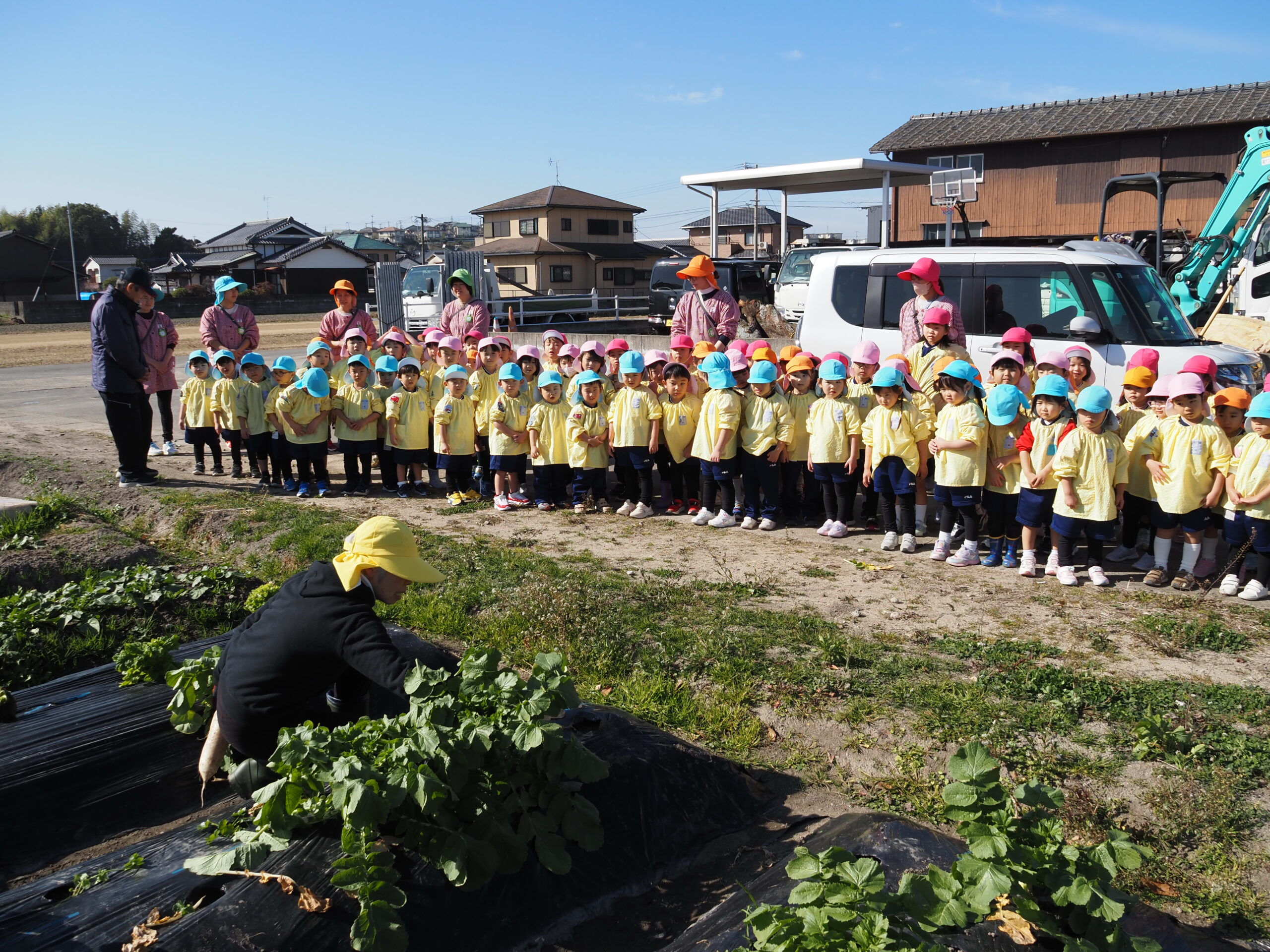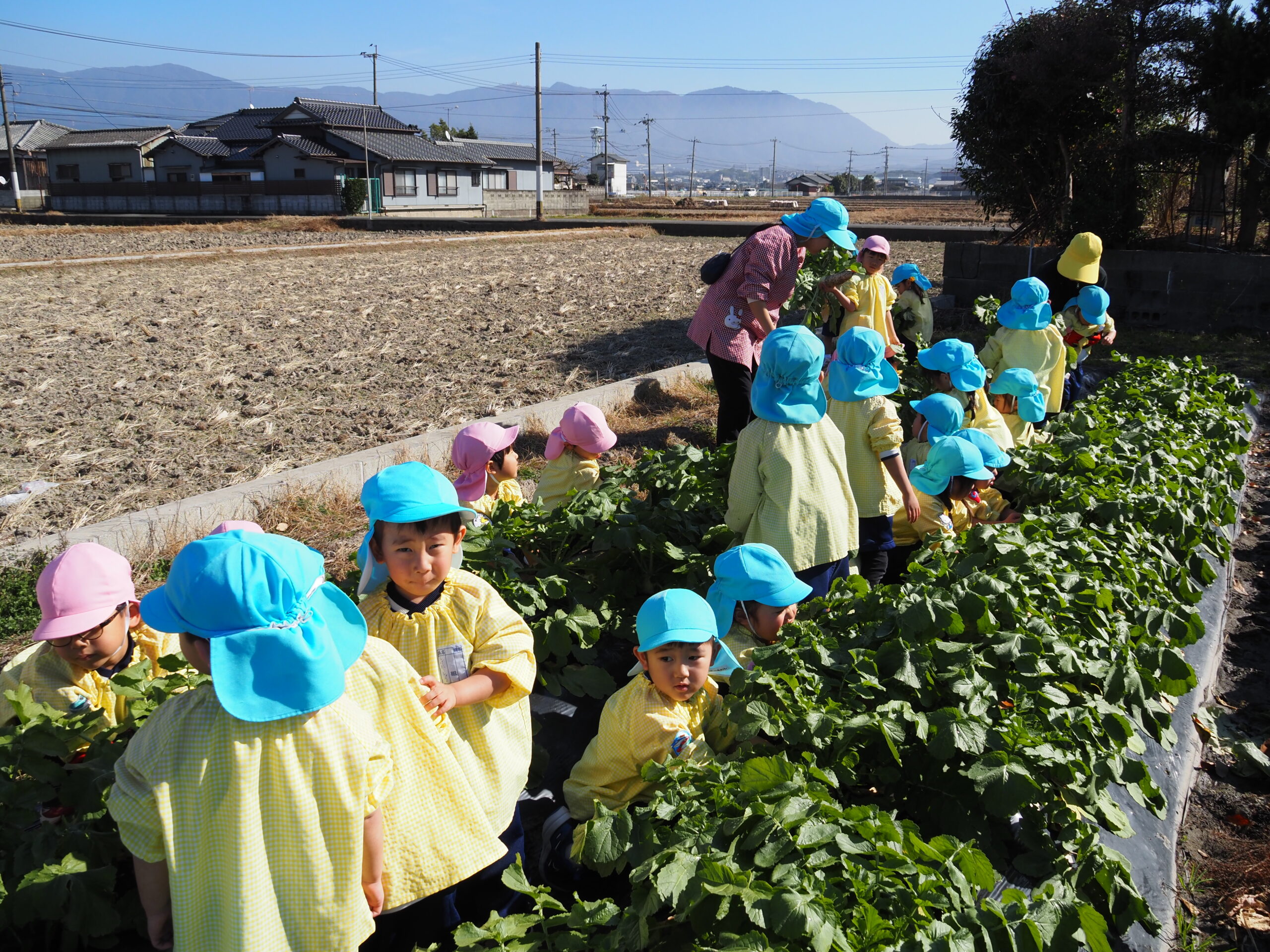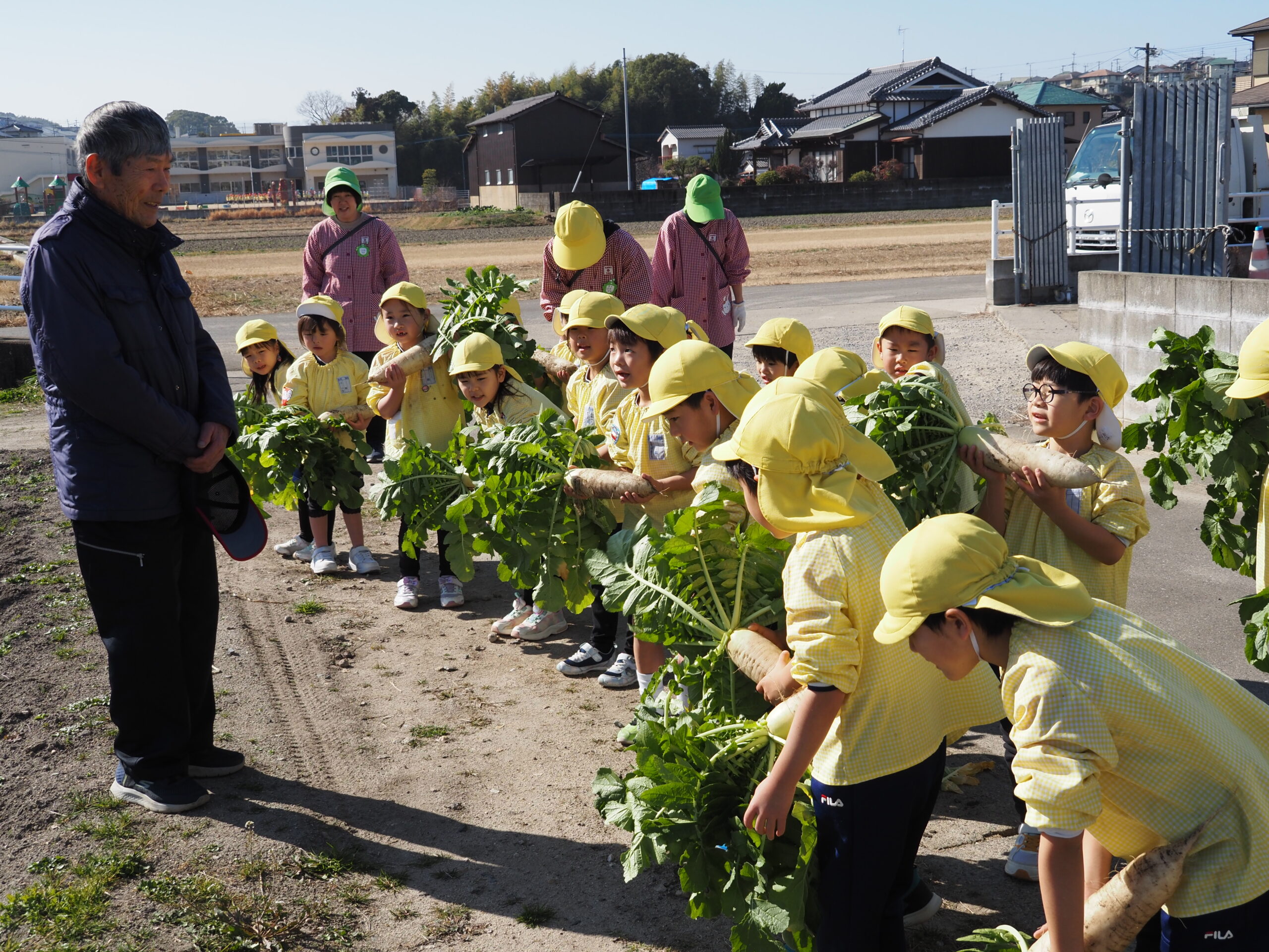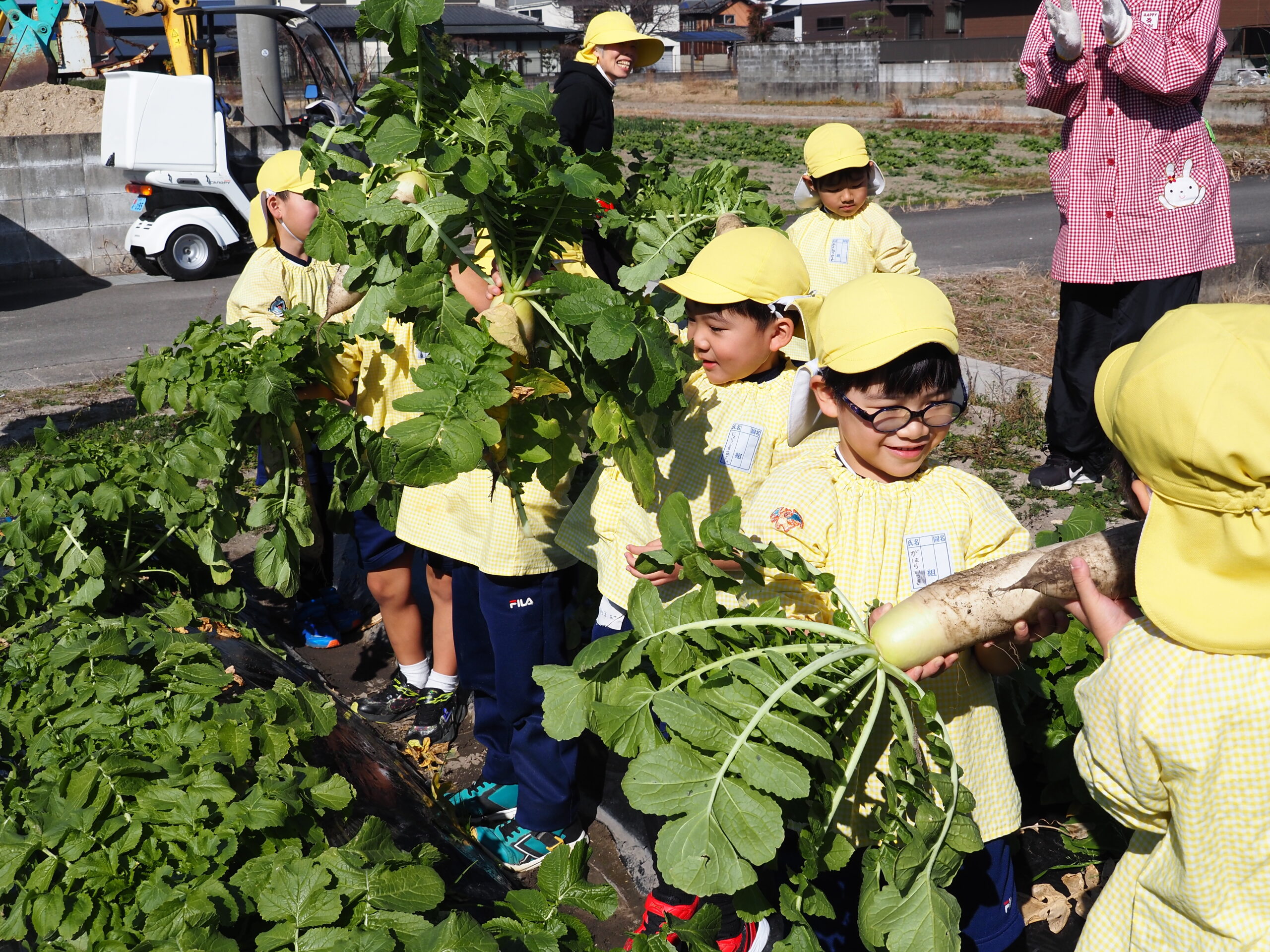 大根取り 2026.01.16 暖かい天候に恵まれ、大根取りを行いました。年長さんが種をまいて、農家の方がお世話をして頂いたおかげで大きな大根を取ることが出来ました。力を入れて大きな大根を抜くと、みんな大喜びでした。 令和8年1月の園庭開放 前の記事