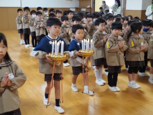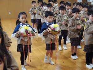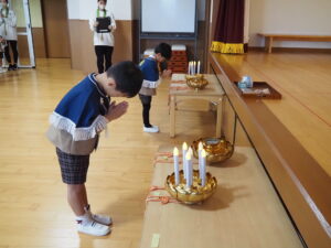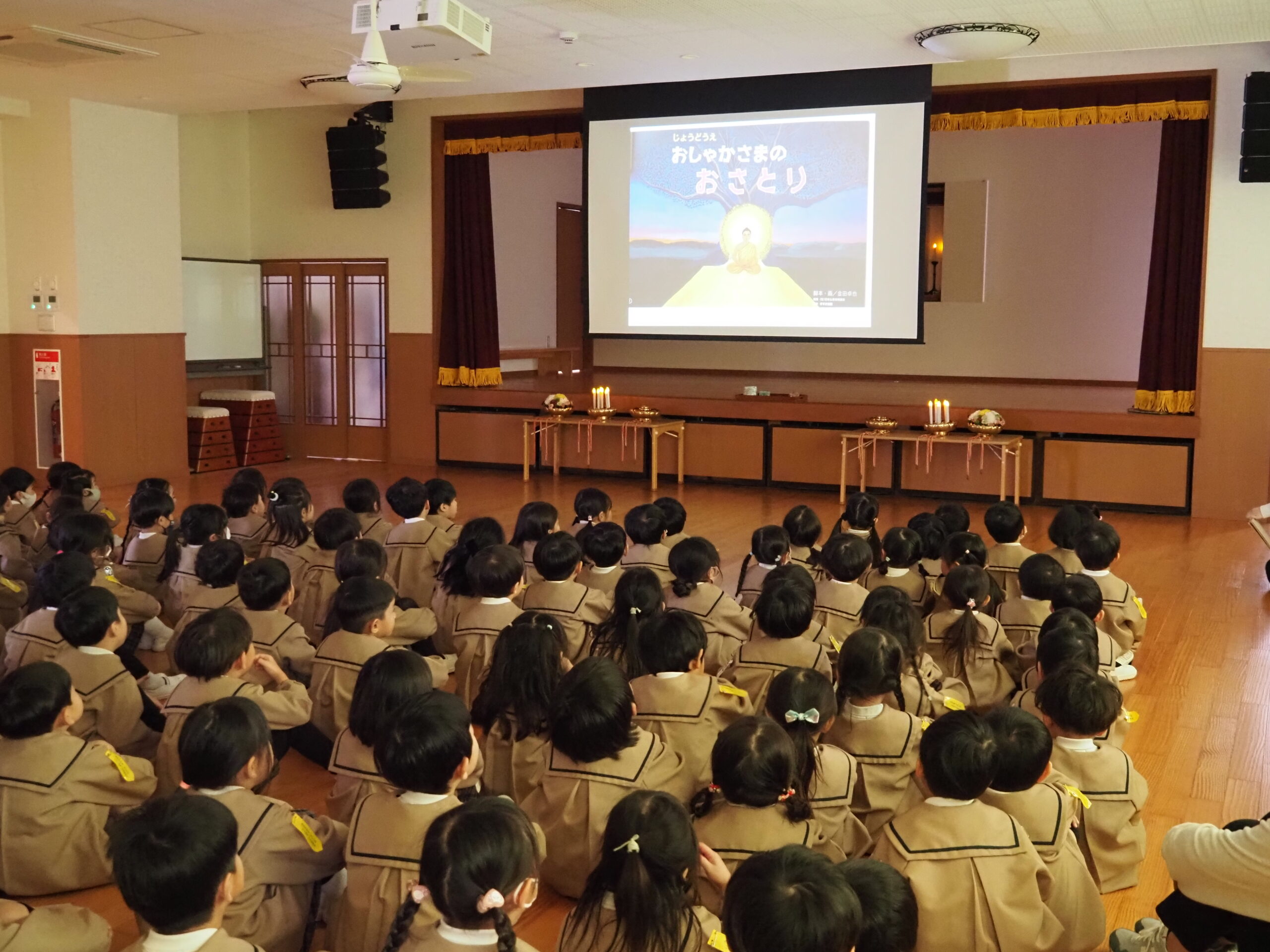 成道会 2025.12.18 お釈迦様がさとりをひらいた日をお祝いする成道会が行われました。年長組のお友達が御仏様にお花などを捧げ、園長先生のおはなしの後、成道会の紙芝居を見たり歌を歌いました。 餅つき 前の記事 ひよこ・つぼみ体験会 次の記事
