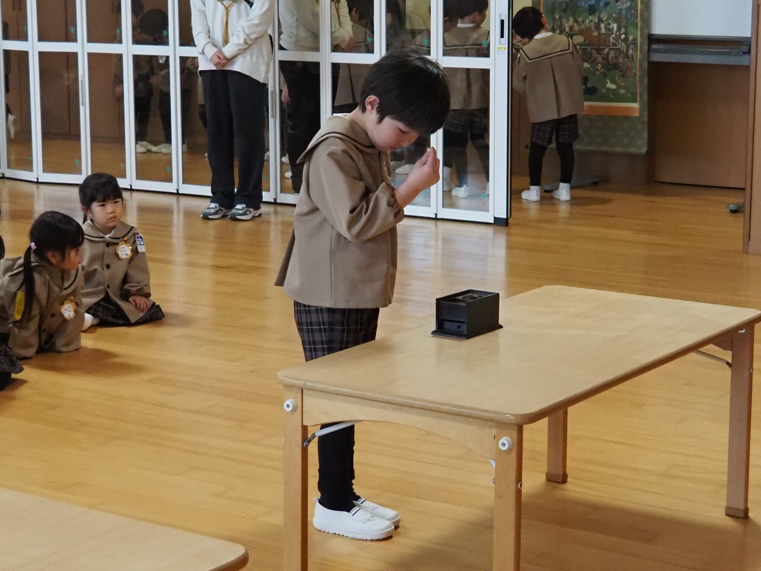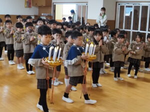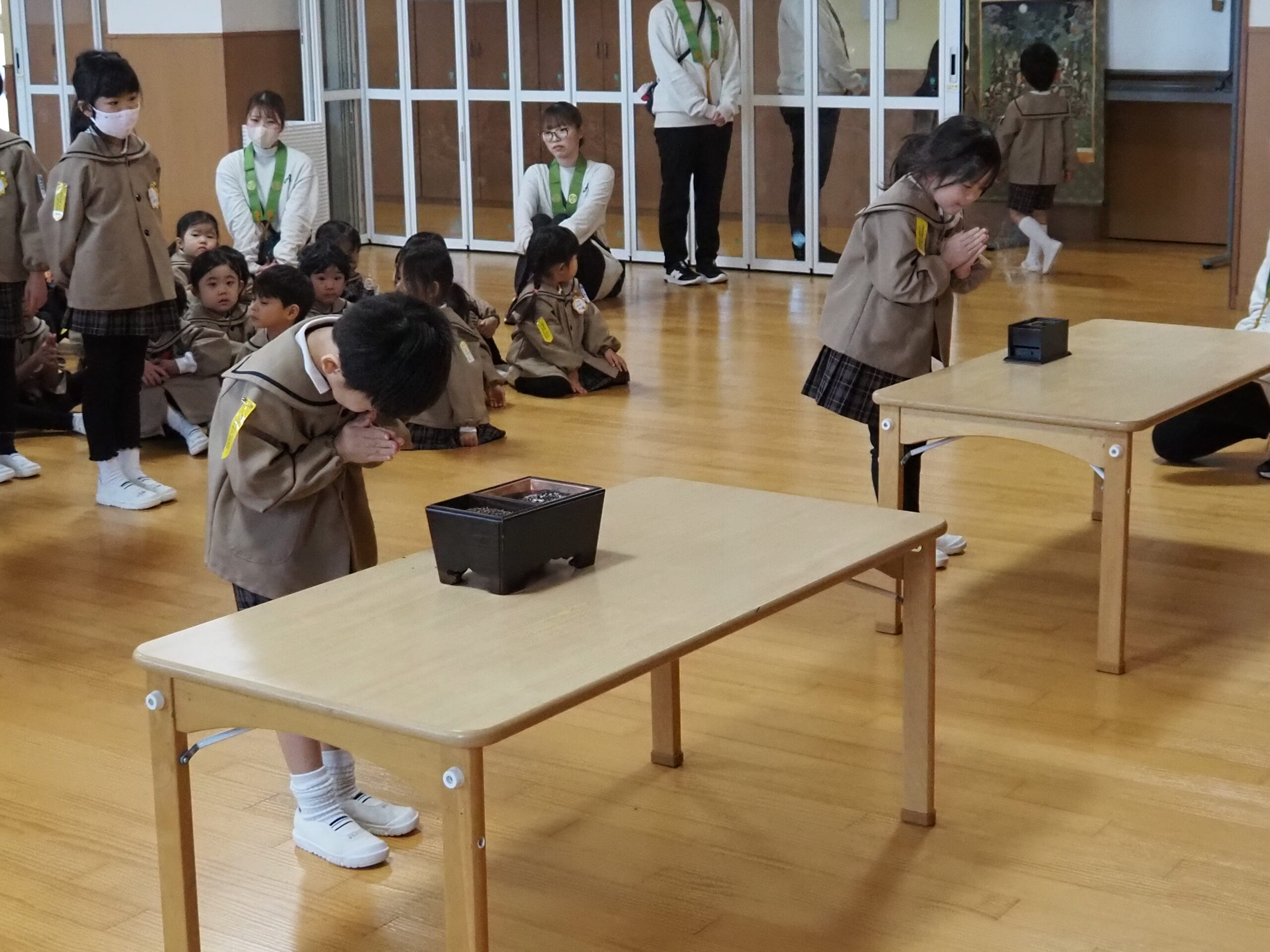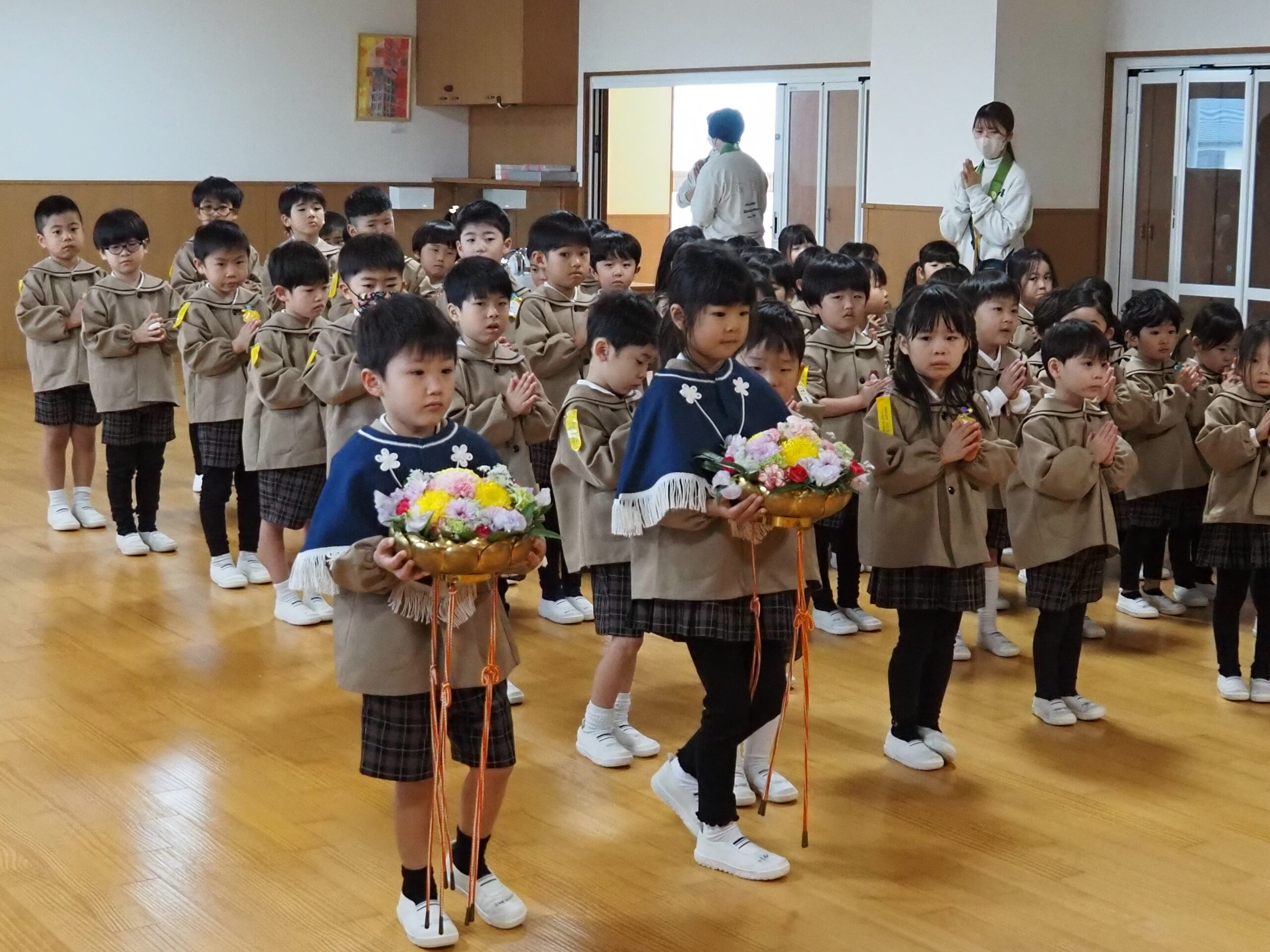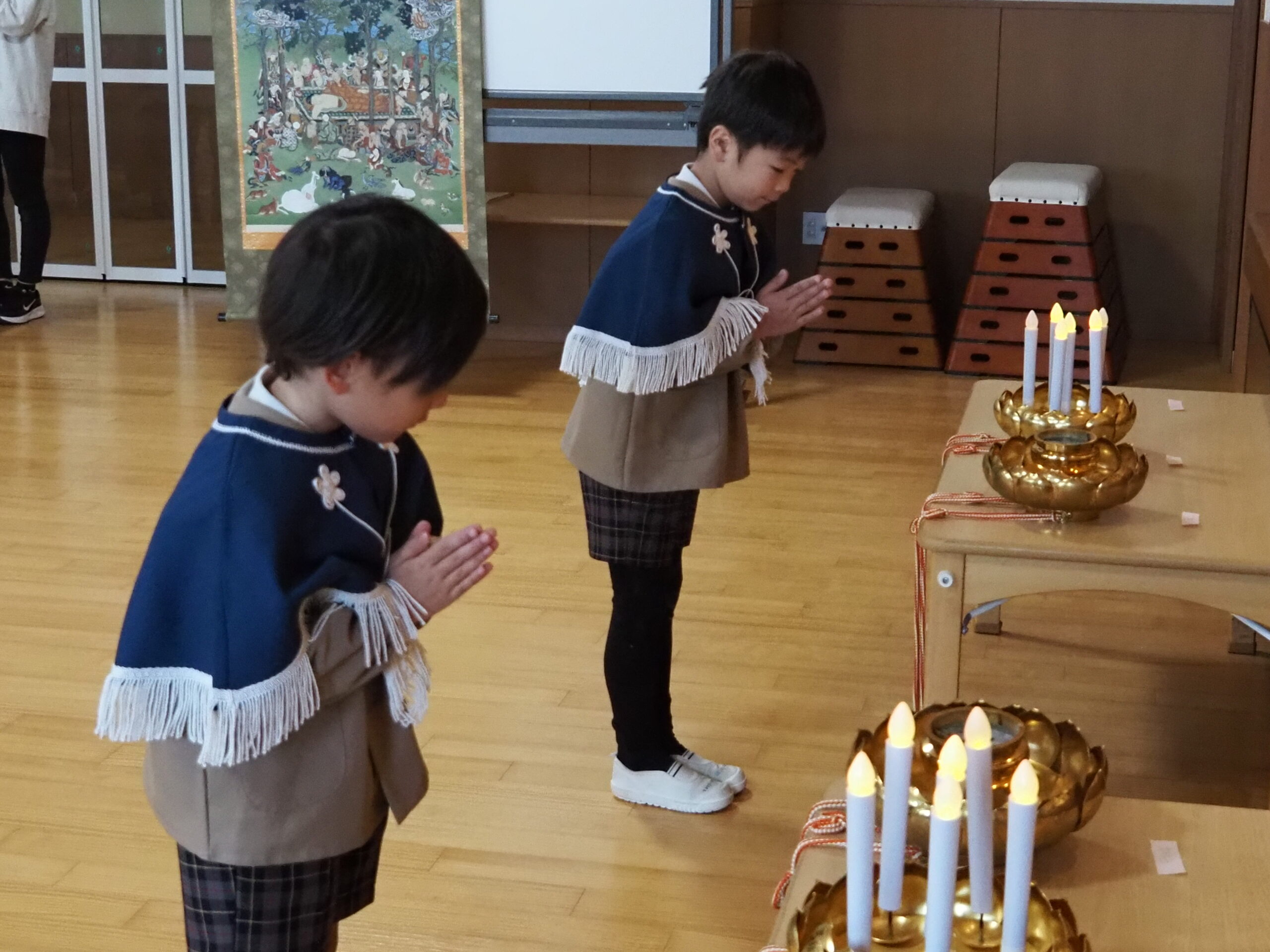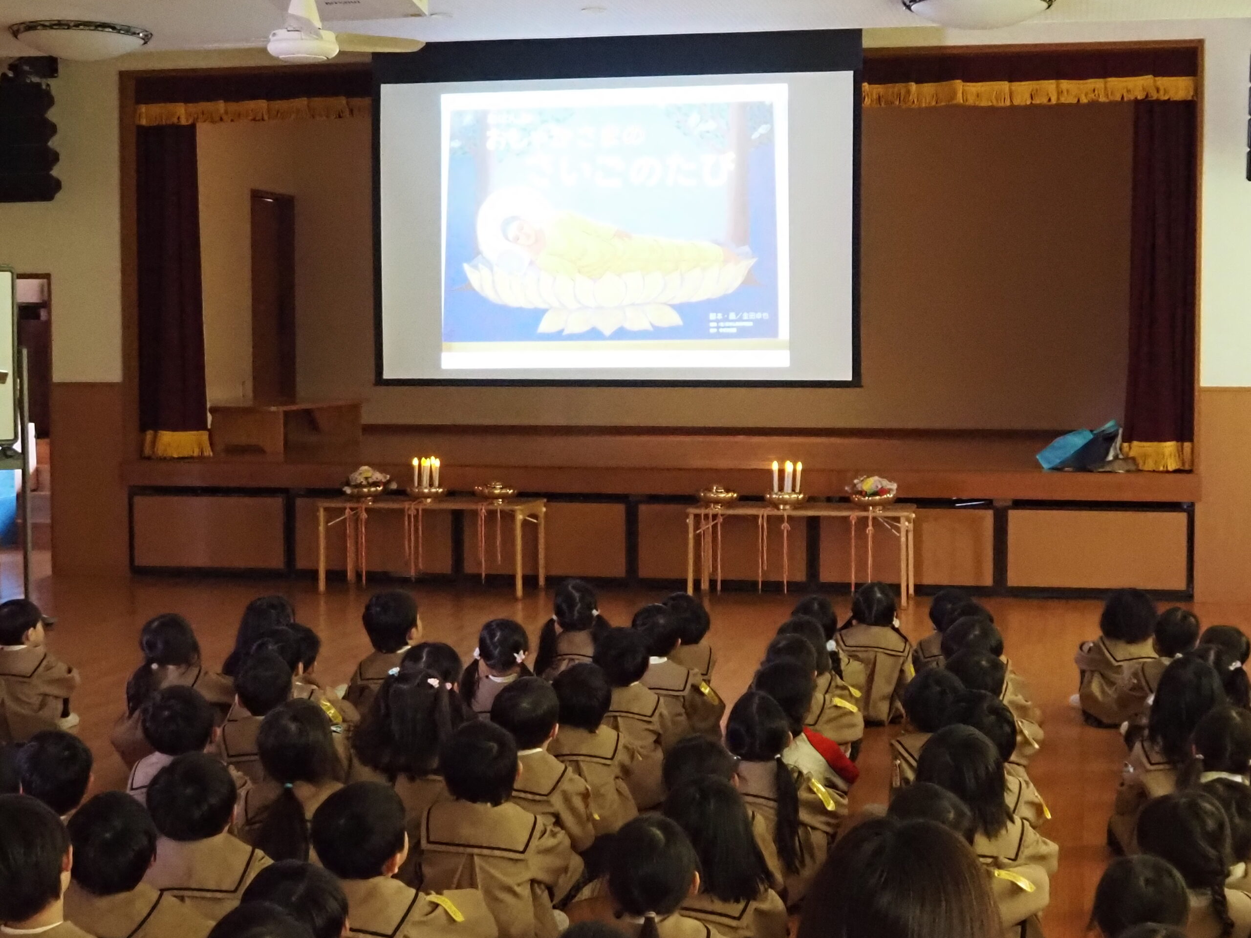 お釈迦様がお亡くなりになった日に、遺徳を偲ぶ涅槃会が行われました。最初、年長組のお友達が御仏様にお花などを捧げ、園長先生のお話の後、紙芝居を見たり歌を歌いました。最後に全員、お焼香をして涅槃図を見ました。